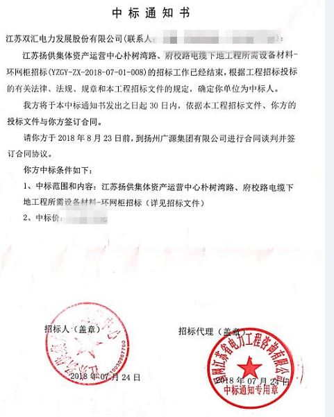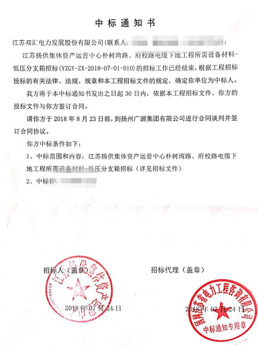 近期,雙匯電力捷報(bào)頻傳,我司電氣開(kāi)關(guān)事業(yè)部2018年7月24日成功中標(biāo)國(guó)網(wǎng)江蘇揚(yáng)供集體資產(chǎn)運(yùn)營(yíng)中心樸樹(shù)灣路、府校路電纜下地工程所需設(shè)備材料項(xiàng)目,中標(biāo)產(chǎn)品包括低壓分支箱、環(huán)網(wǎng)柜等。