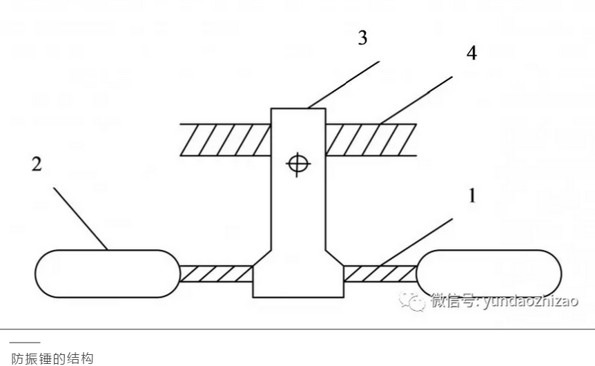 圖中數(shù)字標注的部分分別為:1-鋼絞線,2-錘頭(一般是鋼材),3-中間固定線夾,4-輸電導線。1-3部分共同組成一個完整的防振錘。