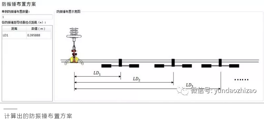 防振錘布置方式的計算是基于電力行業(yè)標準,基于防振錘效果最大化的原則,根據(jù)導線參數(shù),計算出防振錘的安裝位置。