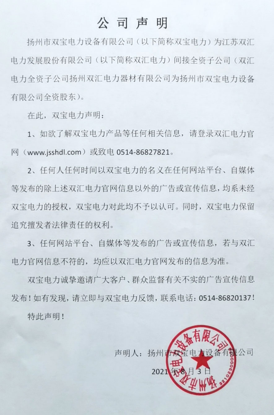 揚(yáng)州市雙寶電力設(shè)備有限公司聲明